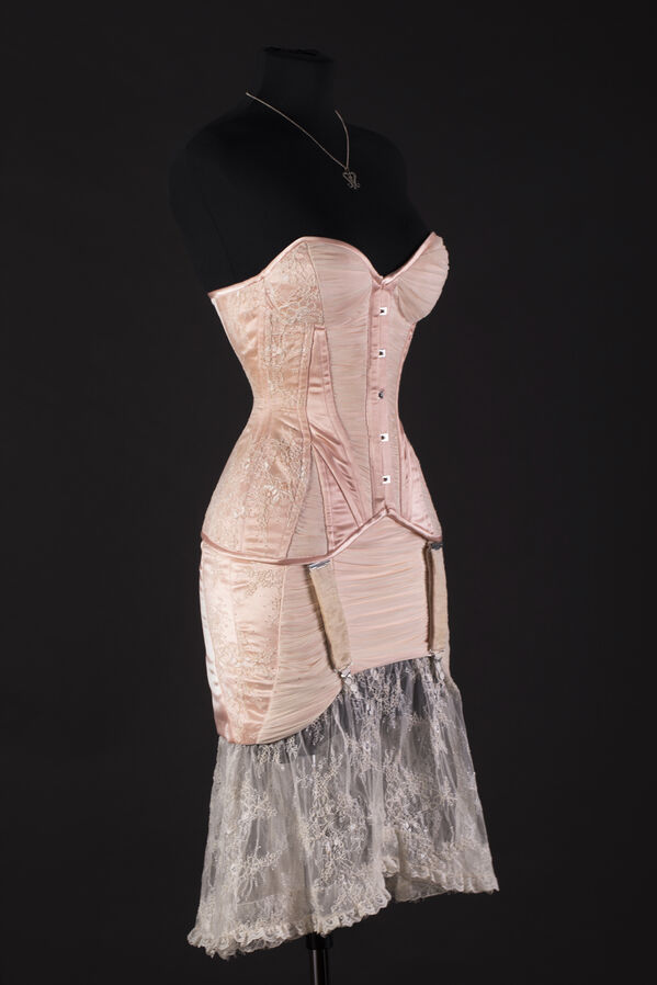 Conjunto de corset art déco com ligas e abotoador de camafeu e saia art déco sobreposta em renda importada. Preço apenas do corset R$ 4.750,00.
