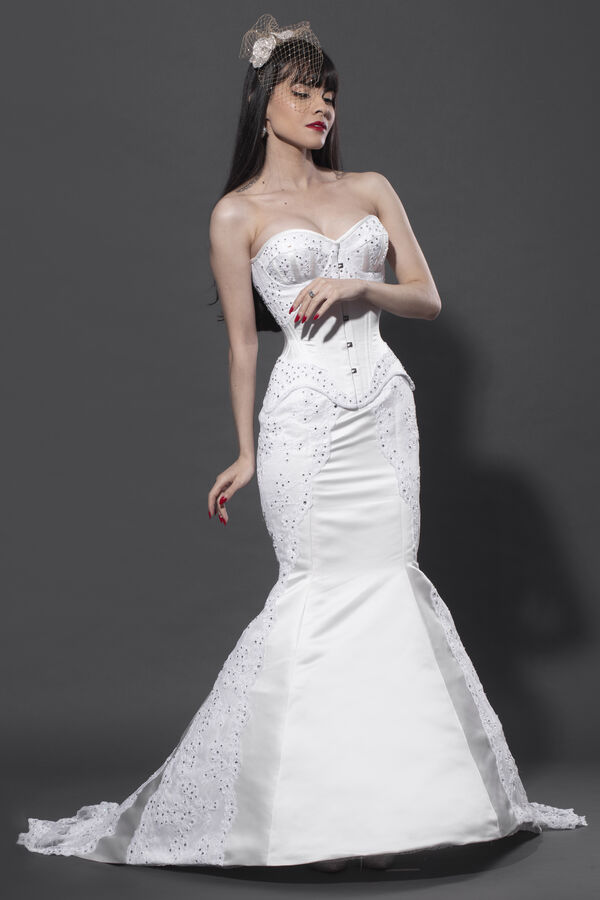 Brigitte Bardot é uma atriz e cantora francesa. Conhecida mundialmente, é considerada o grande símbolo de beleza dos anos 50 e anos 1960. Sinônimo de sensualidade, prestamos uma homenagem à essa incrível mulher com um modelo outwear em uma estética lingerie. Esta é a versão noiva do modelo Brigitte Bardot com saia modelo sereia. Vestido com aplicações em renda e aplicação de brilhos.